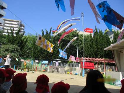 『こいのぼり』の歌を歌うと、園庭のこいのぼりが元気に泳ぎだしました。
