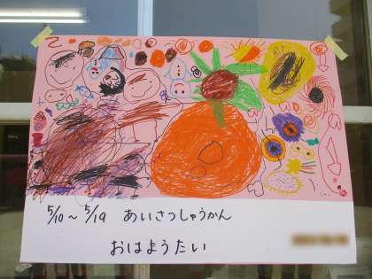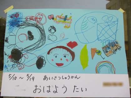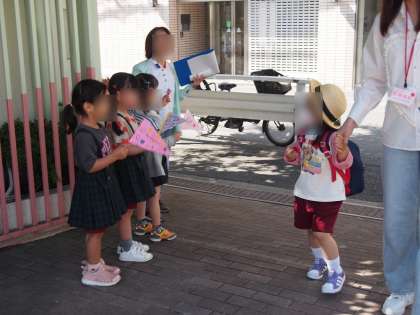 毎朝、きく組(5歳児)の子どもたちが旗をもって、登園してきた友達を迎えています。旗には、いろいろな国の言葉で『おはよう』と書いてあります。みんなで調べたみたいですよ。日東幼稚園には、外国籍の子どもたちがたくさん在籍しています。