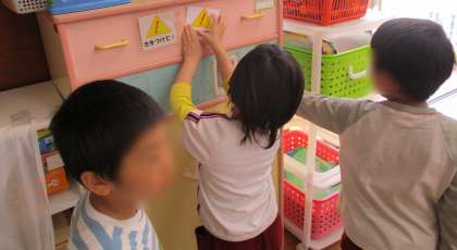 今月、5歳の保健指導では、けがの予防として、けがにつながる場所や行動をみんなで考えました。グループに分かれて、園内を回り、危険予測をした場所に”きをつけて!マーク”を張り付けました。「廊下は走らない」「扉に指を挟まないようにする」「階段は一段ずつゆっくり降りる」など、子どもたちは、真剣に考えていましたよ。