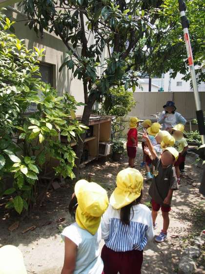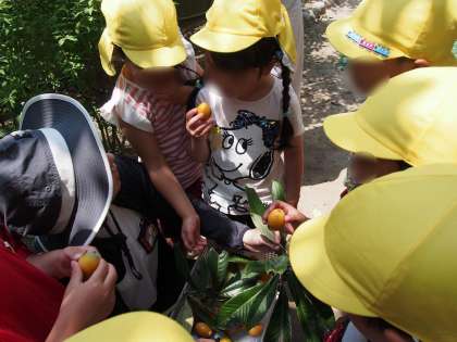 ビワを取って、匂いを嗅いでみると「いい匂い」「甘い匂いする」と