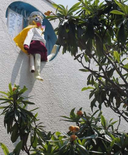 かかしのきららちゃんをつくって、ビワの木の近くに