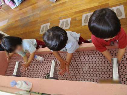 指先や指の間、手首など、石鹸の泡をつけて丁寧に洗うことができていましたよ。「バイキンさん、バイバーイ」と言いながら、手洗い場に向かって手を振っている子どももいました。これからもピカピカに洗おうね。