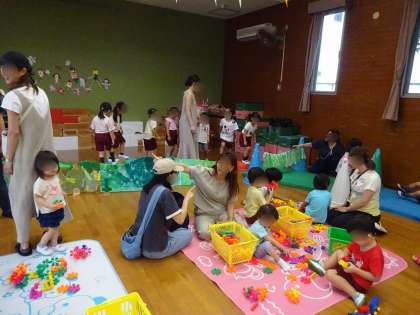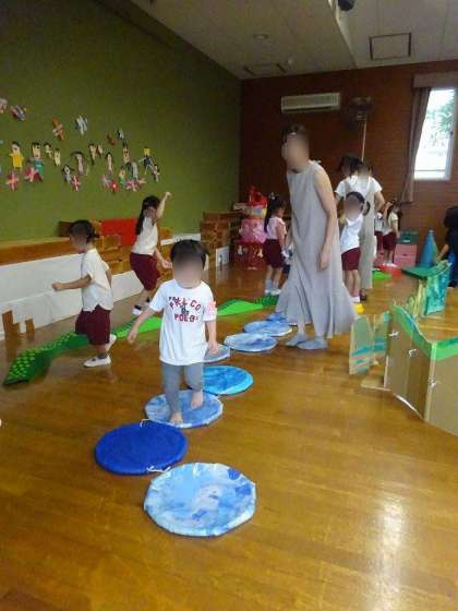園児たちが普段使っている運動遊具で体を動かして遊んだり、みんなで「かえるのみどりちゃん」の体操をしたりして楽しく過ごしました。