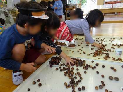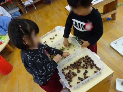 3歳児が保育室にあるドングリを見つけて遊んでいました。「これ丸いね」「緑のドングリ!」「細いの集めたよ」と、色や形の違いに気づいたり、箱に入れてゴロゴロ〜と音や転がる様子を楽しんだりしました。しばらくすると、ままごとの場には、おいしそうなドングリのお料理が並んでいましたよ。