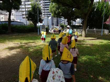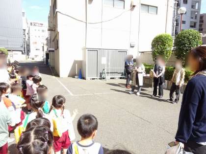 少し前ですが…地震や津波についてクラスで話し合い、防災頭巾をかぶって地域の住宅4Fに避難しました。「頭を守るのが大事!」「高い所に逃げるねん」と話し、最後まで真剣に自分の力で避難しました。地域の方々から「よく頑張ったね」とお土産もいただき嬉しそうな姿も見られました。