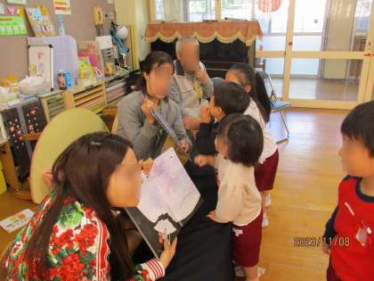 3枚目の写真は「おつきさまってどんなあじ?」という絵本を読んでもらっているところです。思わず体が動き出し、「おつきさま」の味見をしている一コマです。どんな味がしたのかな?