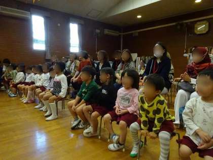 5歳児が日東音楽会で素敵な歌声を聴かせてくれました。今年度はうめ組、さくら組の子どもたち、保護者の皆さんにも来ていただきました。とても緊張した面持ちで入場したきく組の子どもたちでしたが、場の雰囲気にも徐々に慣れていき、堂々と3曲の歌を披露してくれました。最後にはお客さんと一緒に「まつぼっくり」の歌を歌い、みんなでひとつになって楽しく音楽会を締めくくることができました。うめ組、さくら組の子どもたちも「きく組さんすごかった!」「きれいな歌やった!」と憧れのきく組さんに拍手を送っていました。