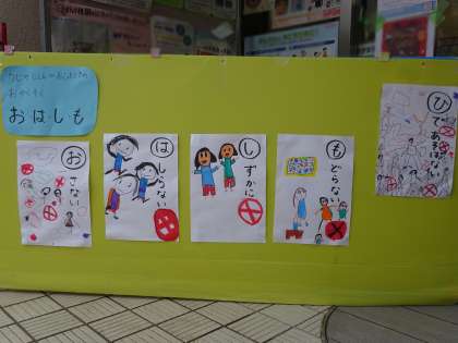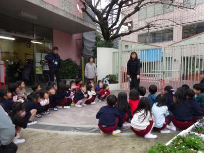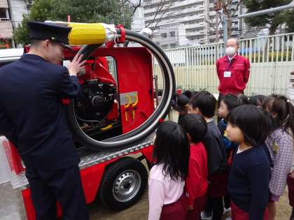 今日は消防協会・浪速消防署の方に来ていただき、「お(押さない)・は(走らない)・し(喋らない)・も(戻らない)」の約束や消火器について(子どもは使いません!)のお話をお聞きしました。ミニ消防車も見せていただきました。
