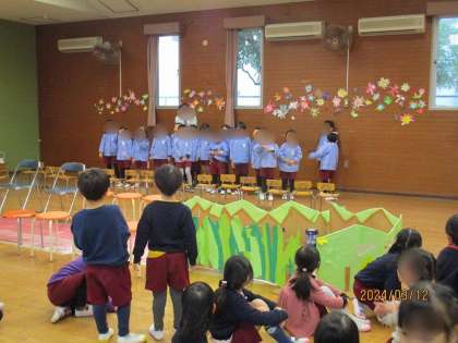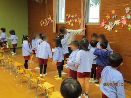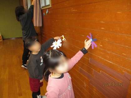 もうすぐきく組さんが修了ということで、さくら組の子どもたちから「みんなで作った花を遊戯室に飾ろうよ!」という声が上がりました。うめ組さんも一緒に遊戯室をお花でいっぱいにしました。きく組さんを呼びに行くと、「うわー!きれい!」と喜んでくれました。