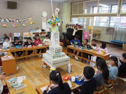 きく組のつくった通天閣を囲んで、幼稚園最後のお弁当を食べました。 次は、小学校の給食楽しみですね。