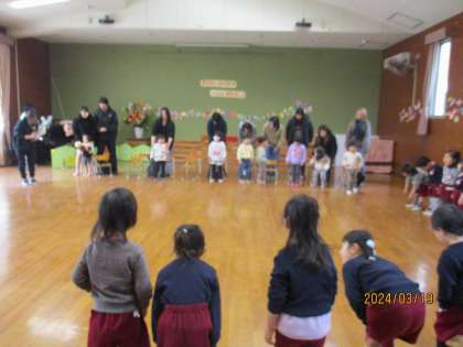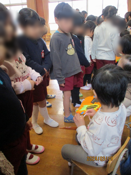 新入園児一日入園 公開日 2024/03/22 更新日 2024/03/22 幼稚園日記 来年度から来る新しいお友達が幼稚園に遊びに来てくれました。 うめ組、さくら組と一緒に園庭で遊んだり、「パンダウサギコアラ」の手遊びをしたり楽しい時間を過ごしました。 うめ組、さくら組は「新しいお友達に喜んでもらいたい」という思いでつくった、カバンと折り紙でつくったチューリップをプレゼントしました。喜んでもらえて嬉しかったですね。 また入園式で会えることを楽しみにしています。 いいね(0)
