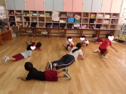 さくら組(4歳児)の子どもたちは、1学期にみんなで育てたアゲハチョウのことを思い出しながら、表現遊びを楽しみました。卵になってじっと動かない子どももいれば、卵のまま先生の方へモソモソと動いていく子どももいます。友達の卵に興味をもって「ツンツン」と触りに行き、友達と関わることを楽しむ姿も見られました。このような遊びを通して、自分の感じたことや考えたことを表現しようとする力が育まれます。また、友達と一緒にやってみたり、違いに気付いたりすることで、人と関わる楽しさや新たな発見もみつかります。