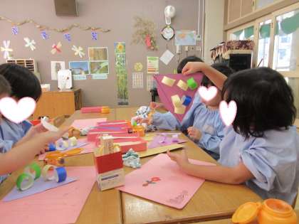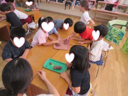 園庭に実ったブドウを見て、触れて、匂いを感じた子どもたち。「いい匂い」「食べたくなる」と感じたことを先生や友達と伝え合う姿がありました。その後、紙を切ったり折り紙を輪にしたりして、ブドウをつくりました。ハサミや糊が思うように使えず「できない」「難しい」と感じる子どももいましたが、教師が「真っすぐに切れなくても、線を見ながら切ってみたら大丈夫だよ」「どこに糊を付けたら輪になるかな?」「失敗しても大丈夫!何度もやってみよう」と声をかけると、安心して挑戦する姿がみられました。自分で考え、試し、繰り返す中で、「できた!」という達成感を味わい、自信へと繋がっていきます。子どもたちが自信をもち、失敗を恐れずいろいろなことに挑戦できるように、これからも保育の環境づくりや言葉かけを工夫していきたいです。