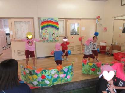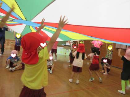うめ組(3歳児)とさくら組(4歳児)は、運動会の遊びを通してきく組(5歳児)への憧れの気持ちをより大きく膨らませています。全園児で遊んだパラバルーンでは、うめ組もさくら組も目をキラキラとさせて風を感じながら存分に体を動かして遊ぶことを楽しんでいました。