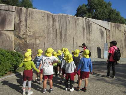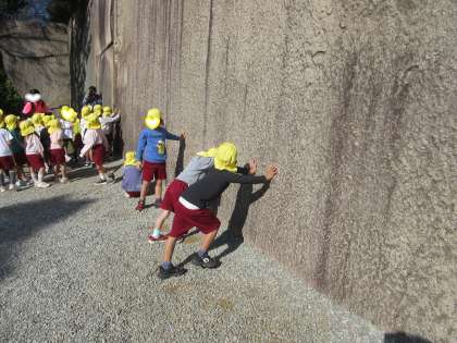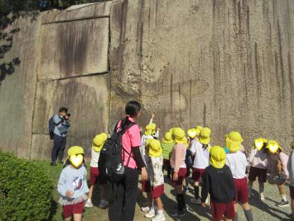 大阪城公園(園外保育)パート1 公開日 2025/10/31 更新日 2025/10/31 幼稚園日記 きく組(5歳児)は、大手門をくぐって城内を見学しました。 大きな蛸石(たこいし)の前では、その迫力に「昔の人はどうやって運んだの?」と友達と押して動かそうとしたり、「タコだ!」と石に浮かび上がるタコの模様に驚いたりしていました。 実際に触れて大きさを感じ模様を見つけることで子どもたちは日本の歴史を体感することができました。 いいね(0)