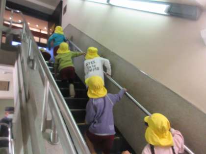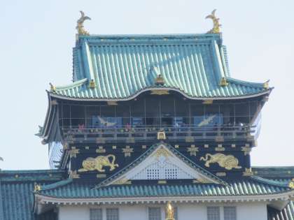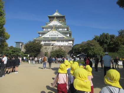 頑張って登った後の景色に子どもたちは喜び、西の丸庭園にいるさくら組(4歳児)・うめ組(3歳児)に「おーい!」と手を振り楽しんでいました。また天守閣から見た通天閣がいつもより小さいことに驚き、天守閣の高さを感じていました。金のシャチホコや虎の飾りも観て日本の伝統文化に興味・関心をもつ姿がみられました。