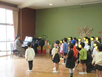 音楽の先生のピアノに合わせて歌う子どもたち