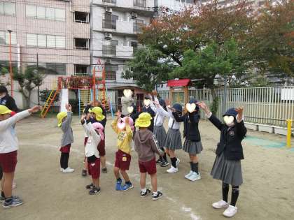 最後は、園庭で園児たちと一緒に体操やリレーをして遊びました。きく組(5歳児)が、「小学校に行ったらよろしくお願いします。」と伝えると、「任せてください!」と頼もしい返事が返ってきて、きく組(5歳児)の子どもたちはとても嬉しそうでした♪