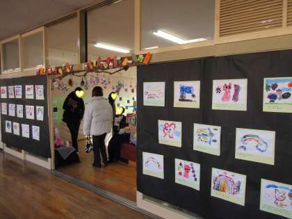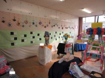 きく組(5歳児)は、クラス全体で「どんな作品展にしたいか」を話し合うところからはじめました。友達や教師と意見を出し合い、クラスのイメージがまとまると、それぞれがつくりたいものを考えながらつくることを楽しんでいました。様々な素材に触れる中で、素材の手触りや形、高さや大きさの違いを発見しながらイメージを膨らませていました。また、テープやのりでは付かない素材にも気付き、どうしたら自分のイメージに近づけるのかを考え、接着の方法や組み合わせ方などを工夫する姿が見られました。困っている友達に声をかけて助け合う姿もあり、きく組(5歳児)ならではの協同性が輝いていました。