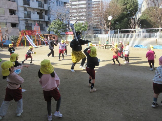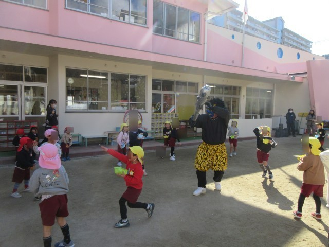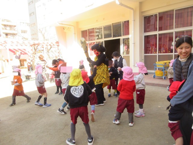 幼稚園で豆まきをしました。みんなの心の中に❝いじわる鬼❞や❝お片付ない鬼❞はいませんか?そんな鬼をみんなで退治しようと、園庭に出たその時です!!「いじわるをする子どもはいないか?「みんな友達と仲良く遊んでいるか?」青鬼と赤鬼がやってきました。「おにはそと!」「ふくわうち!」とみんなで鬼退治しました。これでまた、みんなで楽しく幼稚園で遊ぶことができますね。