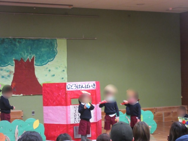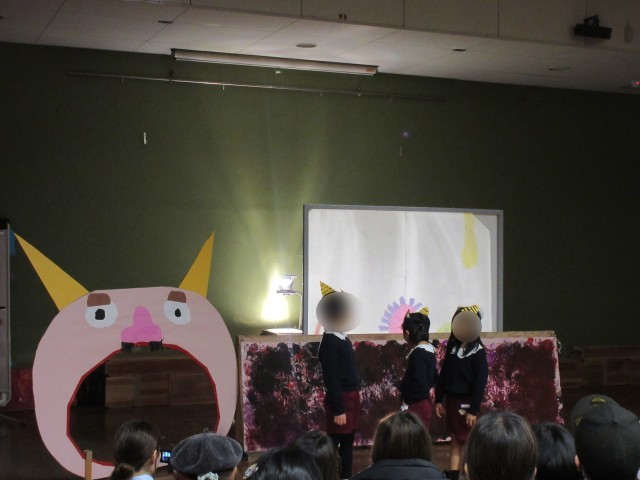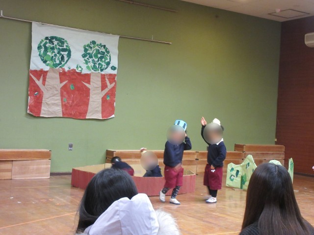 生活発表会を行いました。子どもたちは、日々の保育の中でいろいろな絵本に親しみをもち、友達や先生と一緒にお話の世界で遊ぶことを楽しんでいました。また、いろいろな楽器や音楽に触れ、体でリズムを感じたり友達と気持ちを合わせたりしながら遊んできました。当日は、たくさんのお客さんを前にドキドキしていた子どもたちでしたが、温かい拍手や温かい応援に見守られながら満足感や充実感を味わいました。この経験は子どもたちの大きな自信につながったことと思います。発表会での遊びはこの後も異年齢で関わり合いながら続いていきます。