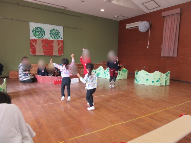 今日はこぐまクラブ(未就園児園庭開放)がありました。発表会で遊んだ合奏や歌、劇遊びをみてもらいました。うめ組(3歳児)の劇遊び『もりのおふろ』では、こぐまクラブの友達も一緒にウサギになってかくれんぼやお風呂に入って遊ぶことを楽しみました。喜んで参加してくれて幼稚園の子ども達も嬉しそうでした。その後はたくさん園庭で遊びました。また遊びに来てくださいね。