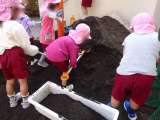 4歳児がイチゴの苗植えをしました。みんなで力を合わせてプランターに土を入れて運び...