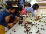 3歳児が保育室にあるドングリを見つけて遊んでいました。「これ丸いね」「緑のドング...