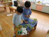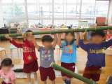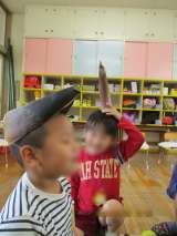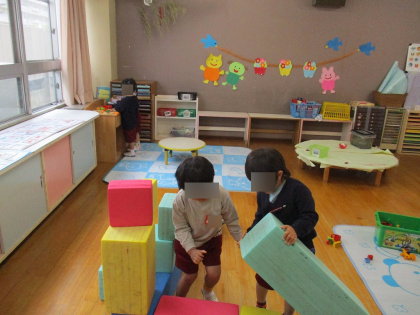 雨の日、遊戯室から楽しそうな声が聞こえてきました。 3歳児と、4歳児の子どもたち...