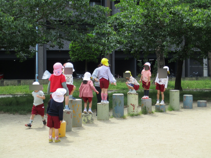 4歳児と5歳児一緒に、幼稚園の近くにある公園へ散歩に行きました。 広い場で体を存...