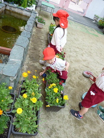 お花を植えているプランターを動かしては、プランターの下に隠れているダンゴムシやミミズなどを発見して、大喜び!