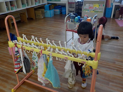 「ここにかばんを置くよ」「ボタン外してあげるね」と一人一人にかかわって朝の準備を一緒に行っていました。