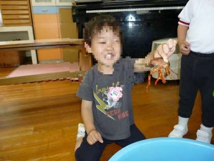 そんなもも組さんに、ツンツンされたり持ち上げられたりするザリガニさん