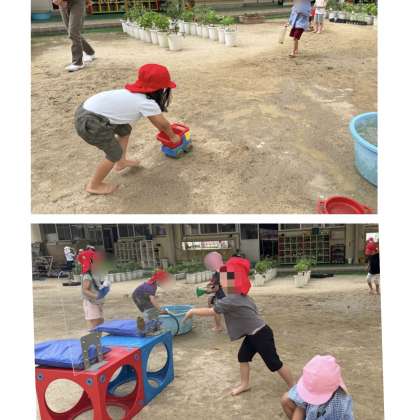 ばら組のお友達はダンプカーの遊具に水をいっぱい入れて、あちこちに運んでいました。