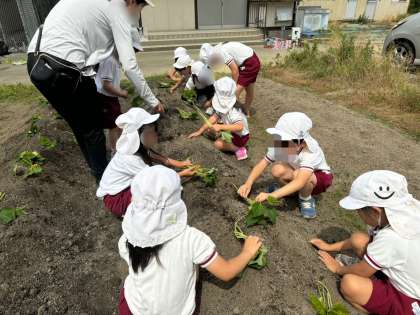 「おいもの赤ちゃんだから、優しく持ってね」「優しく土のお布団をかけるよ」