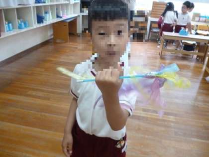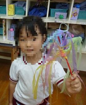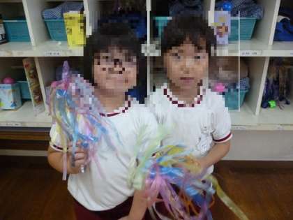 ゆり組の前を通ると、スズランテープでふわふわを作っていました