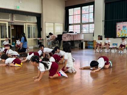 ばら組が、大好きなカメの出てくる「カメカメたいそう」を見せてくれました。カメになってひっくり返ったり、転がったり、かわいかったですよ。