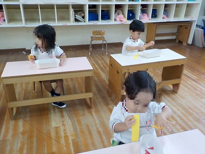 はさみの持ち方、切り方を確認しながら、緑、オレンジ、黄色などの画用紙を、はさみでチョキンと一回切りをしました。