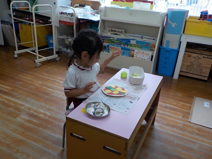 「これは(黄色の画用紙)は、チーズだよ」「これは(緑色の画用紙は、豆だよ」と食べ物をイメージしながらつくっていました。