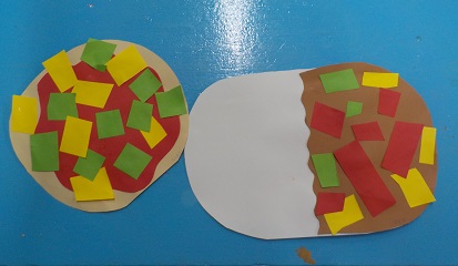 切った画用紙をのりで貼ると美味しそうなピザとカレーライスが完成しました。