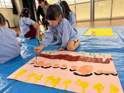 ゆり組が先日の大阪市立音楽会「うたごえひびけなにわっこ」での経験を絵の具で表現していました。