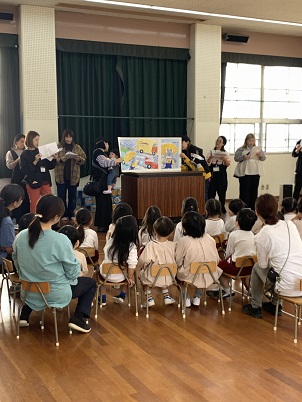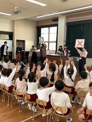 園児たちに伝わりやすいように楽しい紙芝居と、クイズで信号の渡り方や道路に飛び出しては危ないことなどを教えてくれました