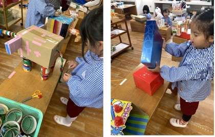 箱と箱を組み合わせて、「パトカー!」と喜んだり