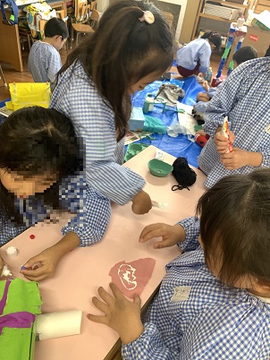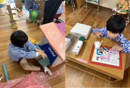 子どもたちは、お家のかたが持ってきてくださったいろいろな材料にイメージを膨らまして遊んでいます