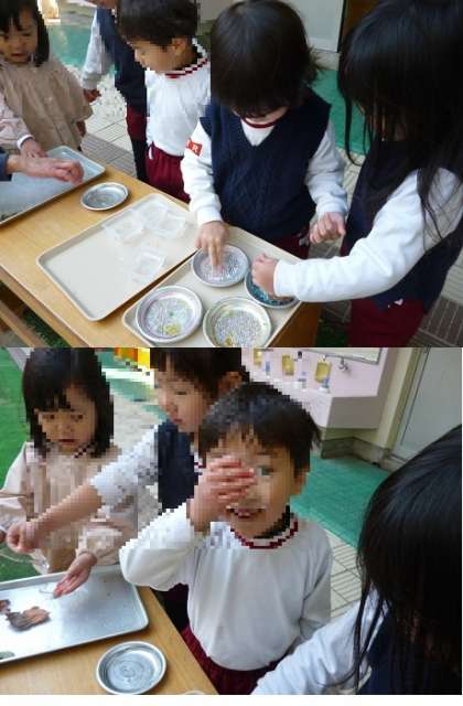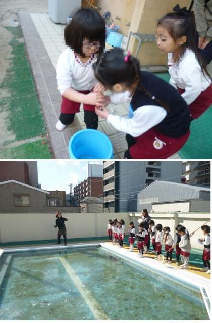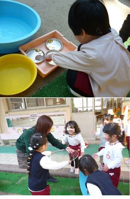 と、先生たちが昨日、発表会のあとに、いろいろな入れ物に水を入れ、