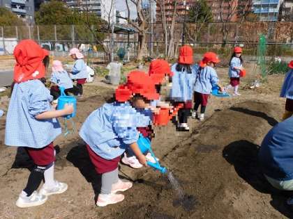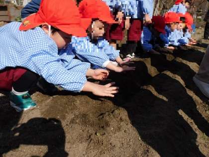 ばら組さんともも組さんで、畑にジャガイモを植えました