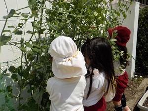 幼稚園の花壇にできた『スナップえんどう』『キンカン』がたくさん実りました。