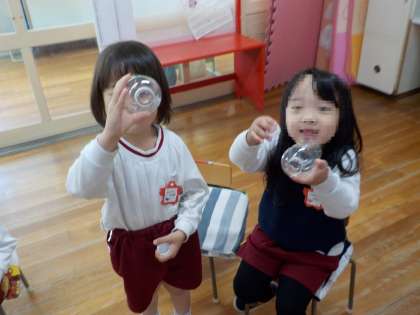 蛇口をひねる手洗い場も使って欲しいと思い、ペットボトルを使って蛇口をひねる動きの練習をしました!