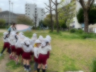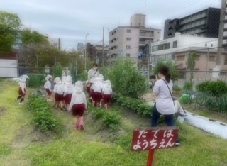 午後、ゆり組が、ばら組に見送られ、畑に出かけました。途中の公園で、タンポポやクローバーなどを見つけたり、桜の花の様子を見たりして、畑に到着。昨年植えた種芋から、葉が生い茂ったジャガイモの周りの雑草を一生懸命に抜いていました。ダイコンみたいなものも見つけ、帰ってから図鑑で調べていました。