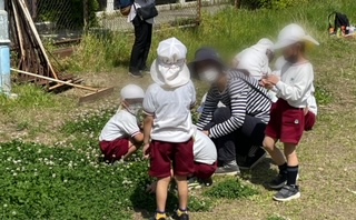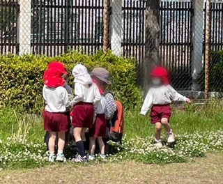 隣のグラウンドでは、クローバーで冠や指輪をつくったり、四葉のクローバー探しをしたりして楽しみました。